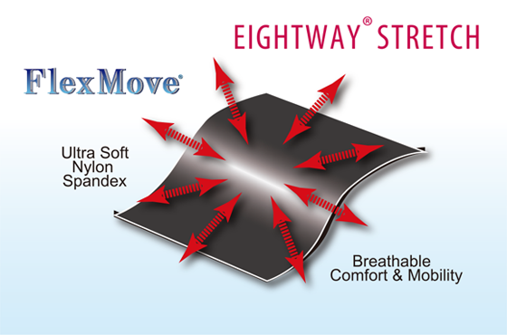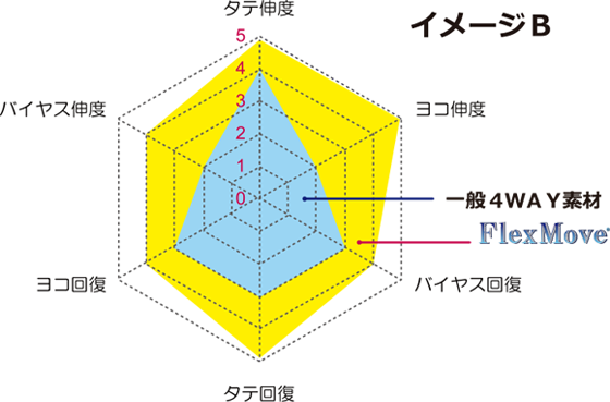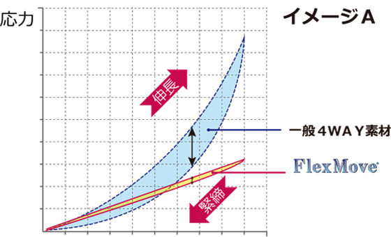 FlexMoveは、一般の4WAY資材に比べ、伸長時・緊締時の応力差が非常に小さく、着用時のフィット感に優れます。