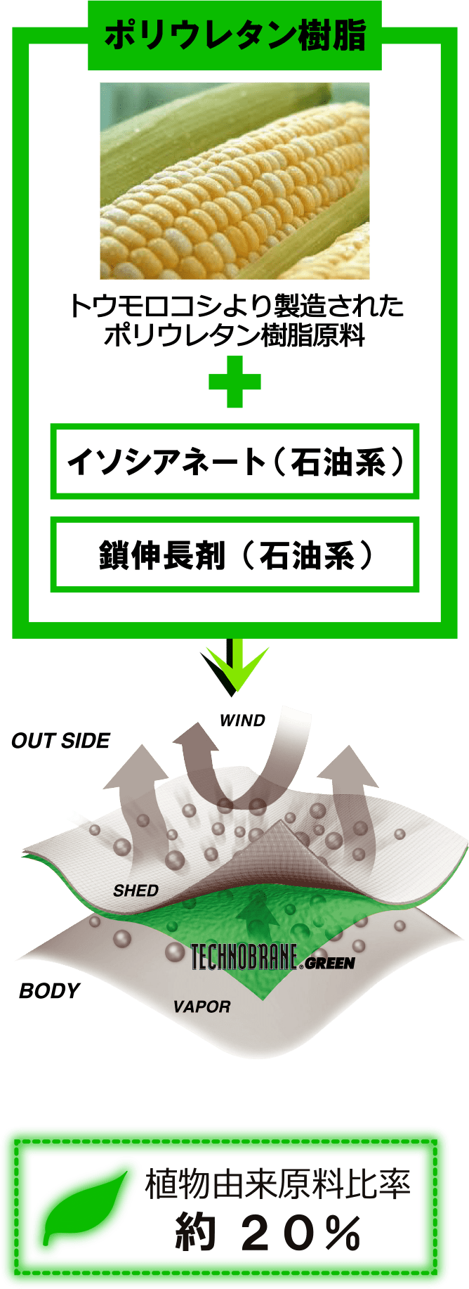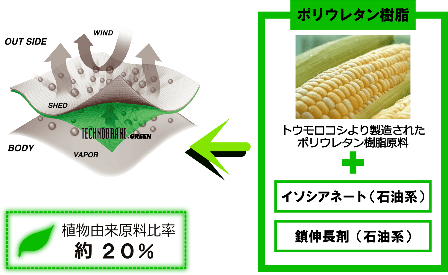 TECHNOBRANE®︎GREENは、従来の石油系100%原料であるポリウレタン樹脂の主原料の一部を