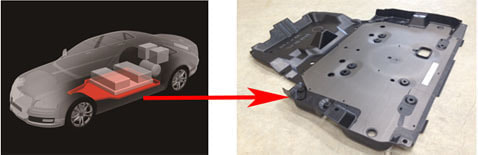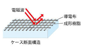 シールド効果をもつ導電布を一体成型することにより、ノイズ源周りに使用されている金属筐体の樹脂化を実現