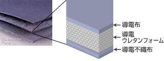 ウレタン多層基材に導電加工したクッション性と導電性を併せ持った「導電フォーム」。面方向だけでなく、厚み方向にも導電性を有します。