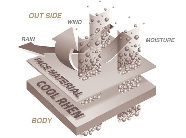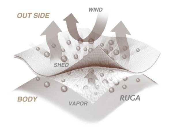 外部からの雨水は通さず、衣服内の湿気を外に出す優れた透湿防水機能で、不快なムレやべたつきを改善し、衣服内をドライな状態にキープするコーティング加工です。