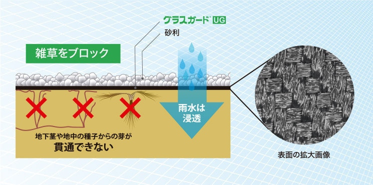美しく整備された庭をきれいに保ちたい。 住宅廻りの砂利敷きにおける除草を手軽にするためには、 防草機能がある下地が効果的です。 グラスガードUG は、繊維を高密度に織り上げることで、 地中から成長する雑草の芽の貫通をブロックすることに成功しました。
