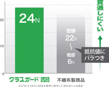 従来の不織布製品は繊維の並びに規則性がなく、ムラが多いため、目の粗い部分では草が貫通するおそれがあります。