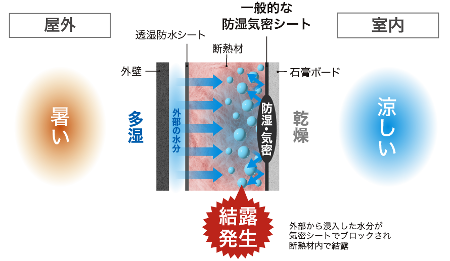 防湿のみの気密シートではこの温度差により壁内に結露が発生しやすい環境になります。