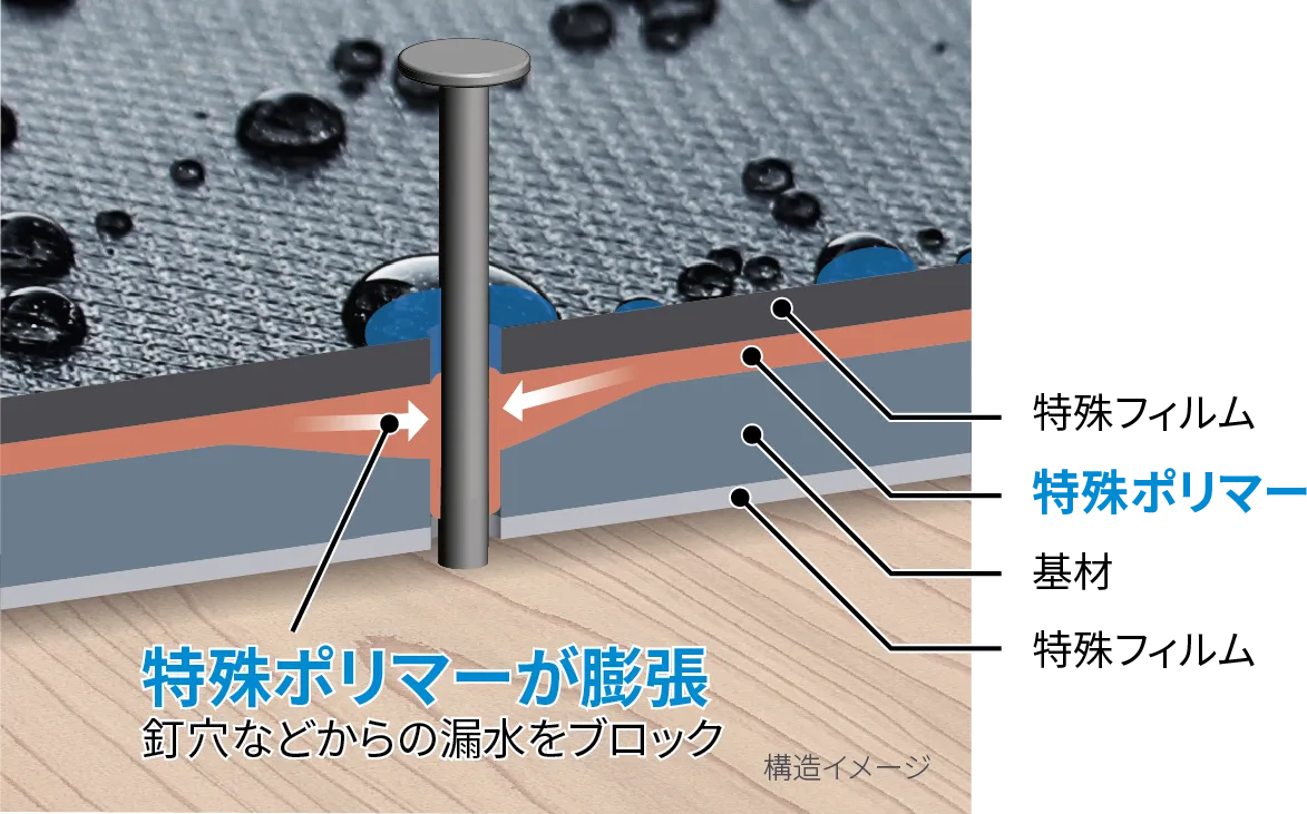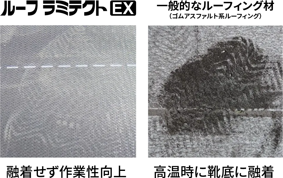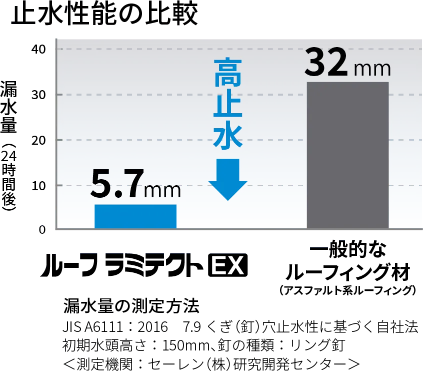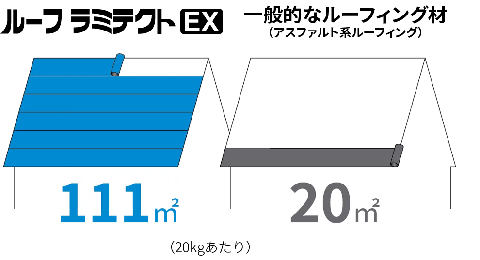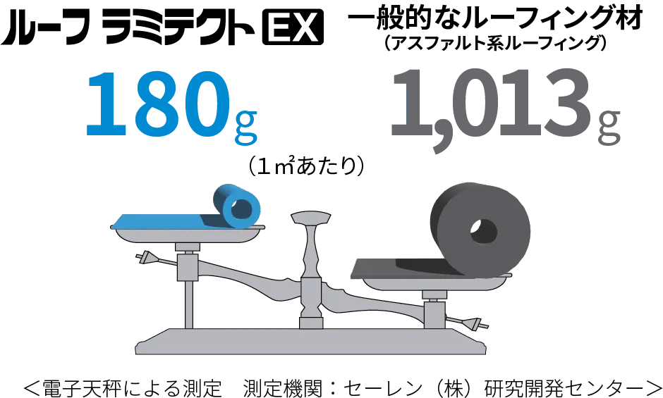 ルーフ ラミテクト®︎ EXはアスファルトを使わずに高い止水性能を発揮させることに成功し、同時にアスファルトの約1/5の軽さを実現しました。