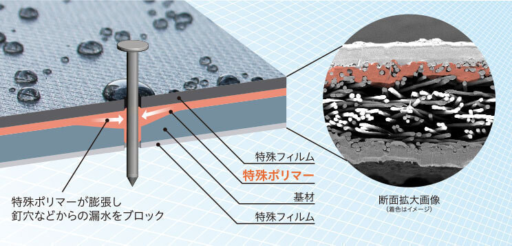 この特殊ポリマーで層を形成することにより、非アスファルト系のルーフィング材として初めて自己止水機能を持たせることに成功しました。