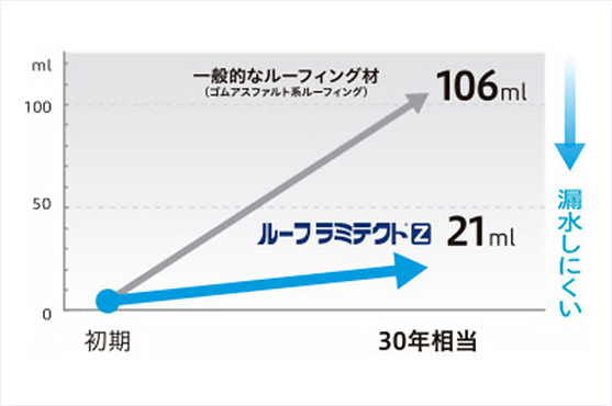 ルーフラミテクトZは、非アスファルト系の材質で構成されているので、熱劣化に対し、非常に強くなっています。30年を想定した促進試験においても高い耐久性を発揮しています。