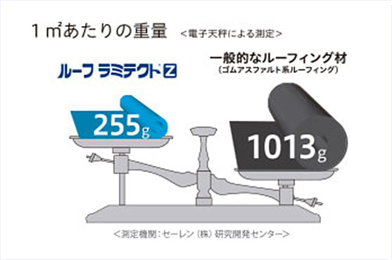 透湿性能ルーフラミテクトZシリーズは一般的なアスファルトルーフィングに比べ非常に軽量で、高所での作業の安全性向上に貢献します。