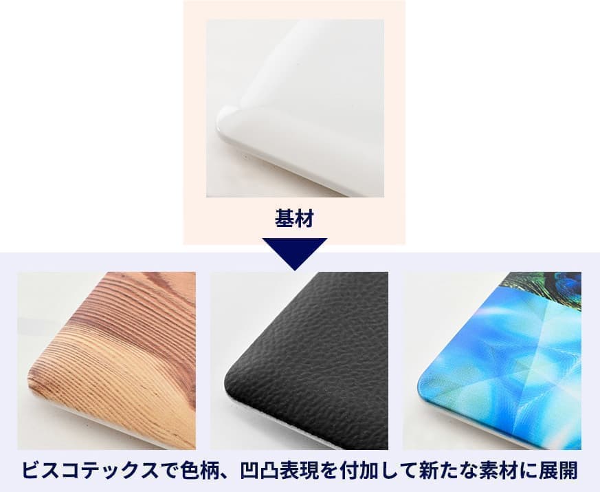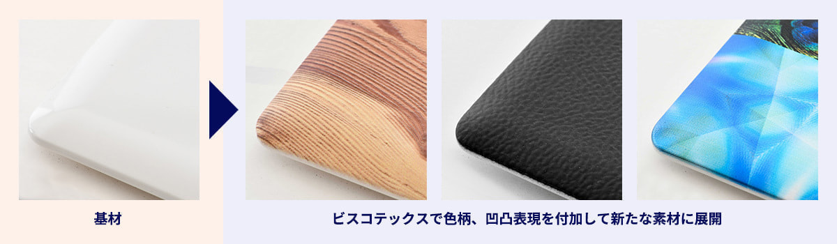 立体と同時着色が可能なビスコテックスの新技術により、従来の加飾工法にはない精細さと凹凸感を持つ新素材が誕生
