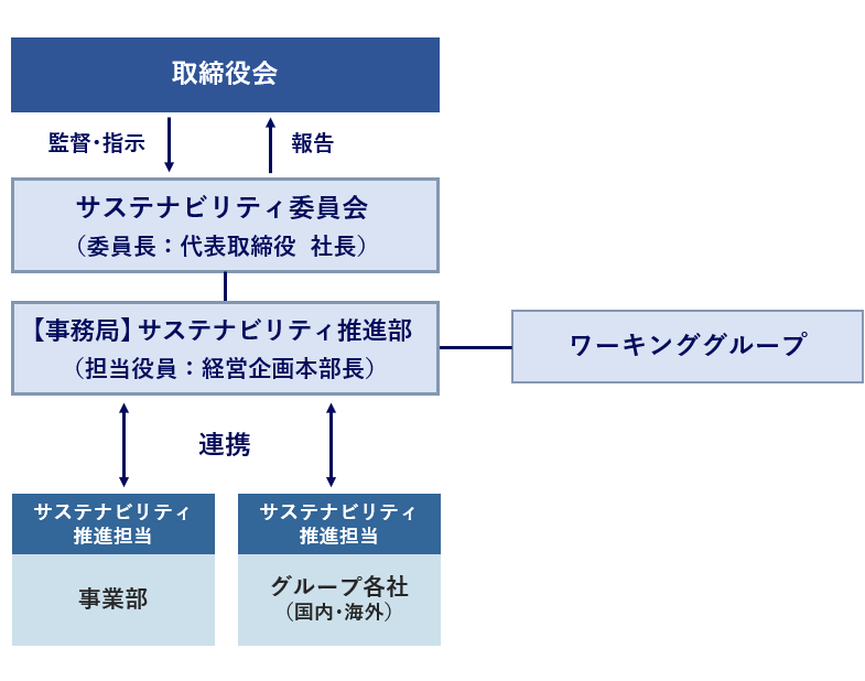 また、専任組織であるサステナビリティ推進部はサステナビリティ委員会の事務局を担当するとともに、各テーマの進捗管理及びサステナビリティ戦略の検討・立案を行い、サステナビリティ委員会に提言します。