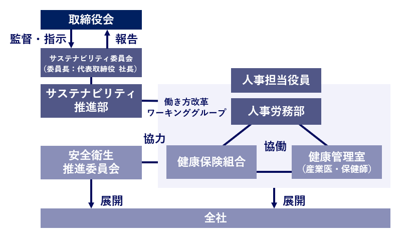 人事担当役員の下、人事労務部を中心に、健康保険組合、健康管理室、サステナビリティ推進部(働き方改革ワーキンググループ ※)が協働し、安全衛生委員会の協力の下、施策実行に取り組んでいます。施策及び結果については、社長を委員長とするサステナビリティ委員会にて審議、取締役会に報告、指示を仰いでいます。